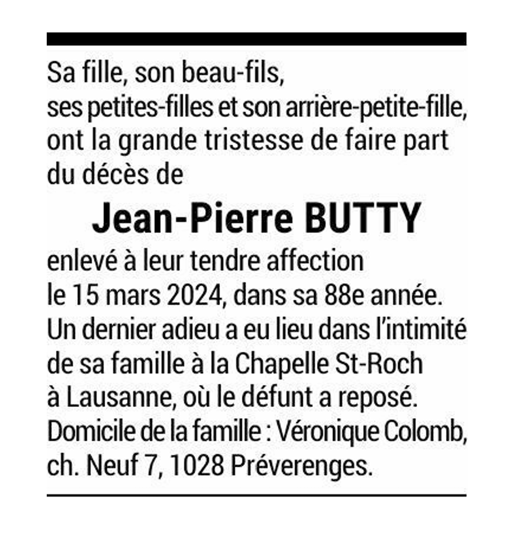 Jean-Pierre BUTTY 06 nov. 1936 - 15 mar. 2024 Avis mortuaire PFG Télecharger PDF Partager sur: Galerie PreviousNext PreviousNext