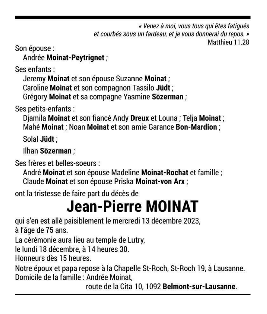 Jean-Pierre MOINAT 13 juin. 1948 - 13 déc. 2023 Avis mortuaire PFG Télecharger PDF Partager sur: Galerie PreviousNext PreviousNext