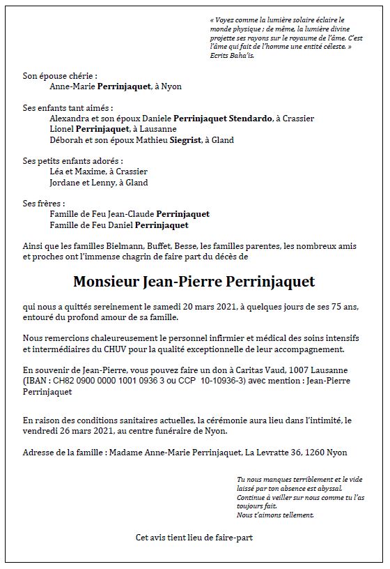 Jean-Pierre Perrinjaquet 06 avr. 1946 - 20 mar. 2021 Avis mortuaire PFG Télecharger PDF Partager sur: