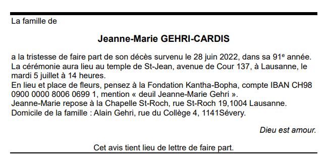 Jeanne-Marie GEHRI-CARDIS 01 aoû. 1931 - 28 juin. 2022 Avis mortuaire PFG Télecharger PDF Partager sur: Galerie PreviousNext PreviousNext