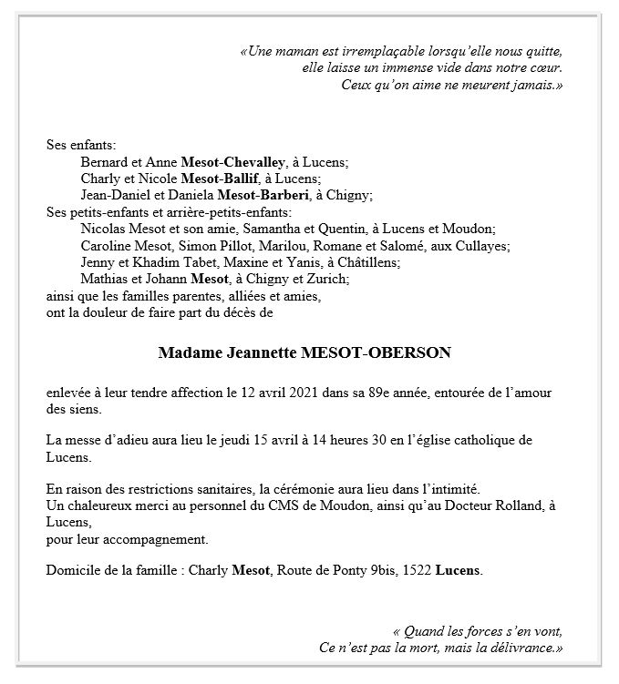 Jeannette MESOT-OBERSON 04 nov. 1932 - 12 avr. 2021 Avis mortuaire PFG Télecharger PDF Partager sur: Galerie PreviousNext PreviousNext