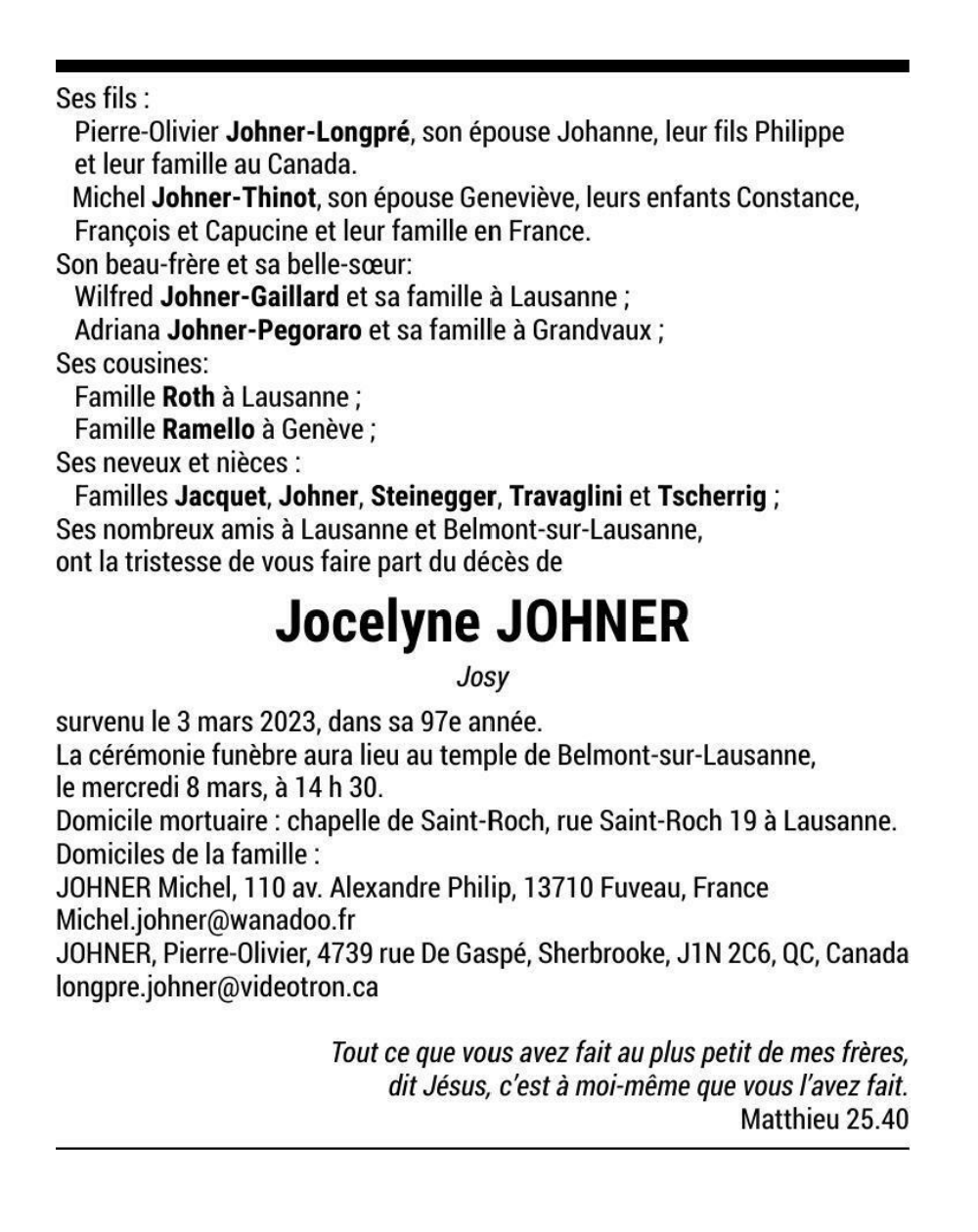 Jocelyne JOHNER 16 oct. 1926 - 03 mar. 2023 Avis mortuaire PFG Télecharger PDF Partager sur: Galerie PreviousNext PreviousNext
