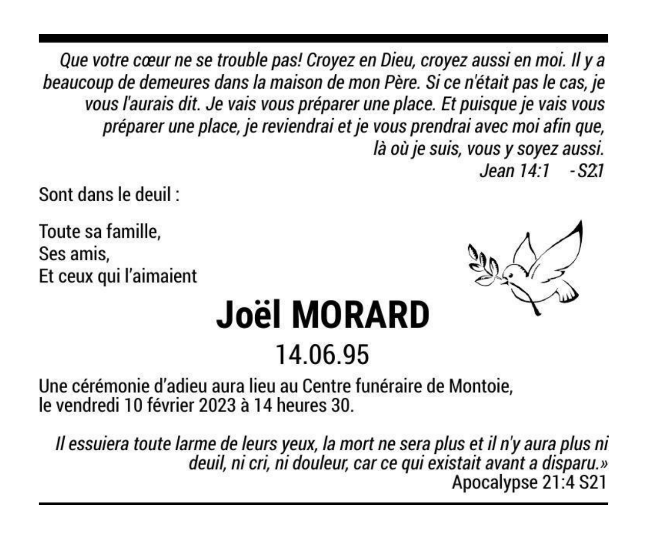 Joël MORARD 14 juin. 1995 - 04 fév. 2023 Avis mortuaire PFG Télecharger PDF Partager sur: Galerie PreviousNext PreviousNext