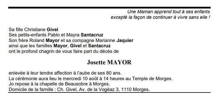 Josette MAYOR 21 aoû. 1942 - 03 aoû. 2022 Avis mortuaire PFG Télecharger PDF Partager sur: Galerie PreviousNext PreviousNext