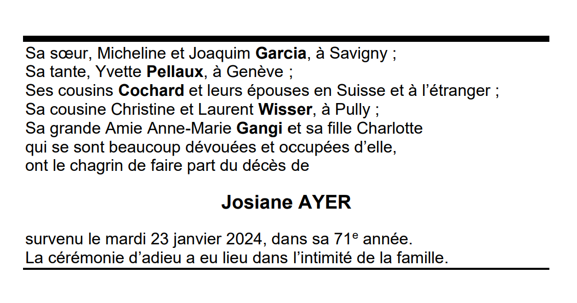 Josiane AYER 26 mai. 1953 - 23 jan. 2024 Avis mortuaire PFG Télecharger PDF Partager sur: Galerie PreviousNext PreviousNext
