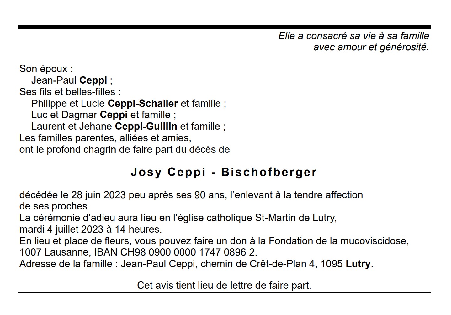 Josy Ceppi - Bischofberger 26 juin. 1933 - 28 juin. 2023 Avis mortuaire PFG Télecharger PDF Partager sur: Galerie PreviousNext PreviousNext