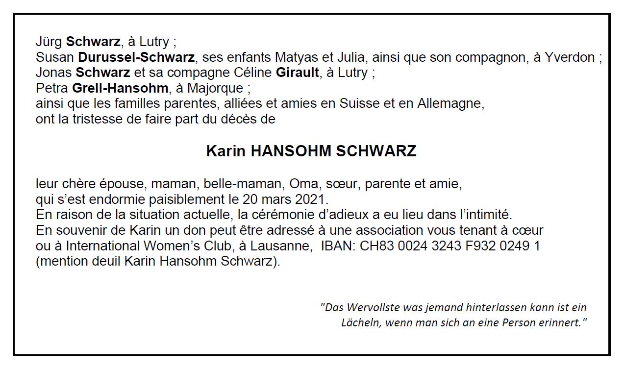 Karin HANSOHM SCHWARZ 19 avr. 1942 - 20 mar. 2021 Avis mortuaire PFG Télecharger PDF Partager sur: Galerie PreviousNext PreviousNext