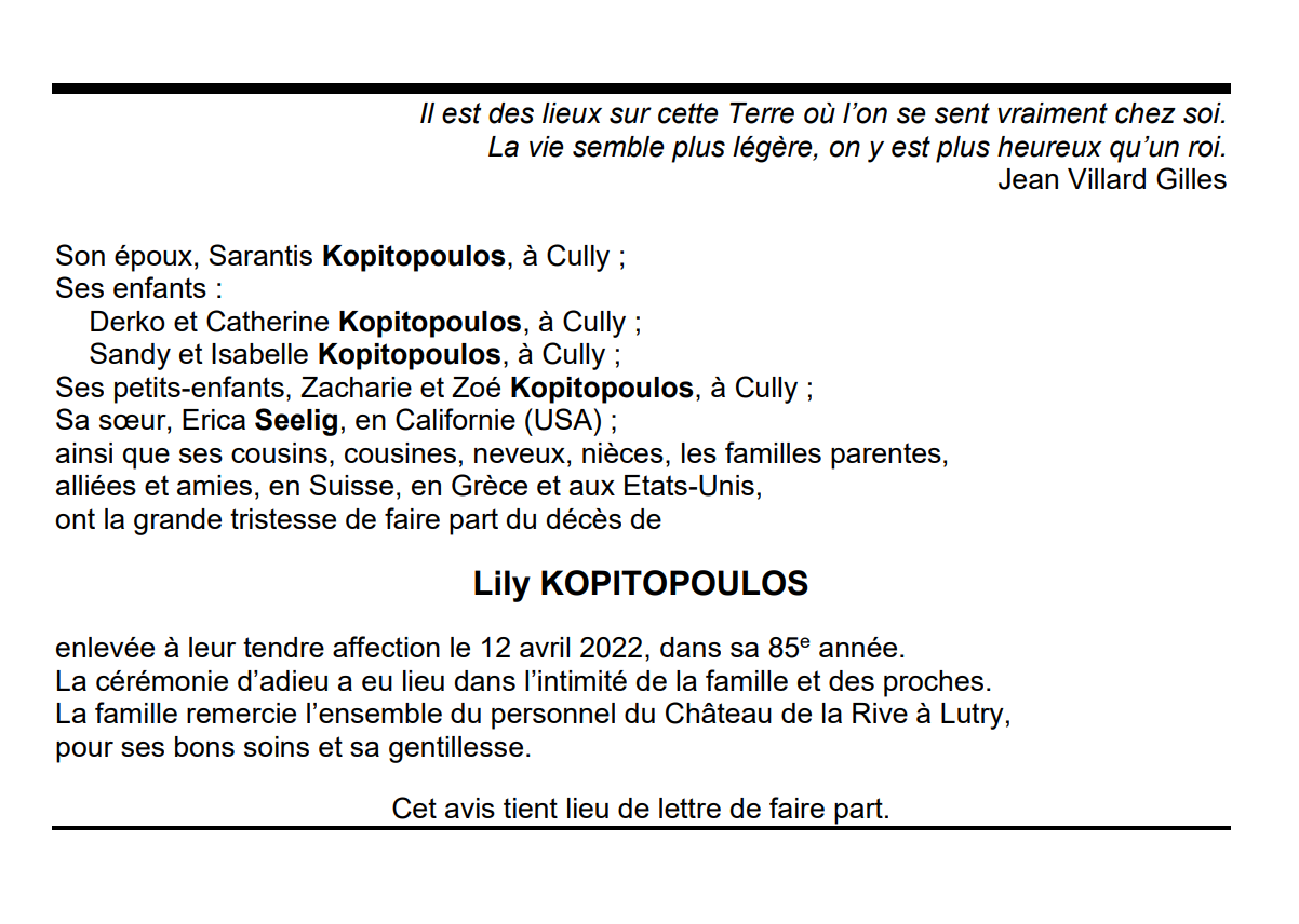 Lily KOPITOPOULOS 05 mar. 1937 - 12 avr. 2022 Avis mortuaire PFG Télecharger PDF Partager sur: Galerie PreviousNext PreviousNext