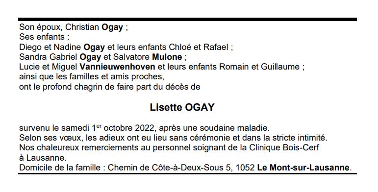 Lisette OGAY 30 aoû. 1937 - 01 oct. 2022 Avis mortuaire PFG Télecharger PDF Partager sur: Galerie PreviousNext PreviousNext