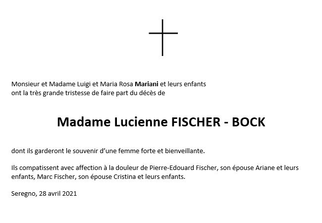 Lucienne FISCHER - BOCK 23 mai. 1928 - 16 avr. 2021 Avis mortuaire PFG Télecharger PDF Partager sur: Galerie PreviousNext PreviousNext