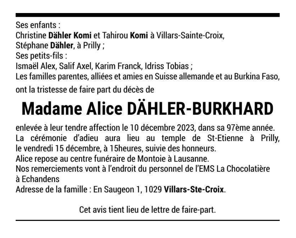 Madame Alice DÄHLER-BURKHARD 07 mai. 1931 - 10 déc. 2023 Avis mortuaire PFG Télecharger PDF Partager sur: Galerie PreviousNext PreviousNext