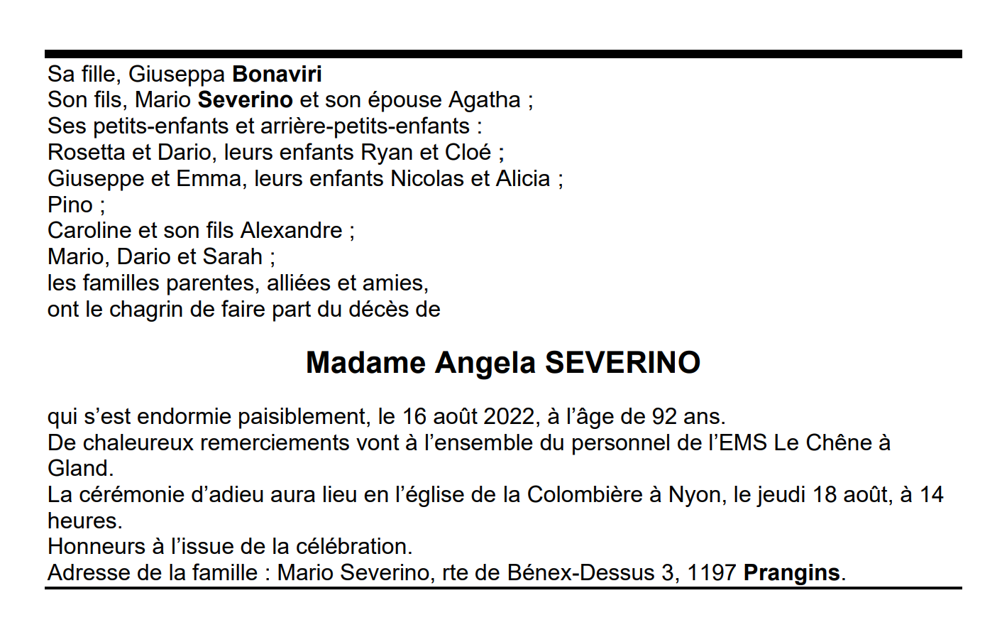 Madame Angela SEVERINO 01 mai. 1930 - 16 aoû. 2022 Avis mortuaire PFG Télecharger PDF Partager sur: Galerie PreviousNext PreviousNext