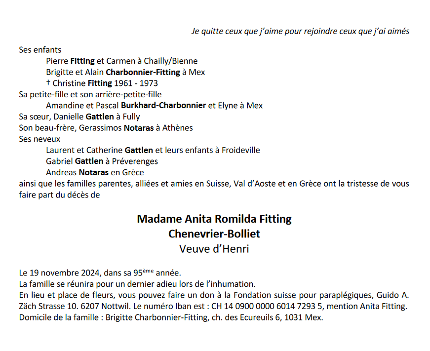 Madame Anita Romilda FITTING 17 juin. 1929 - 19 nov. 2024 Avis mortuaire PFG Télecharger PDF Partager sur: Galerie
