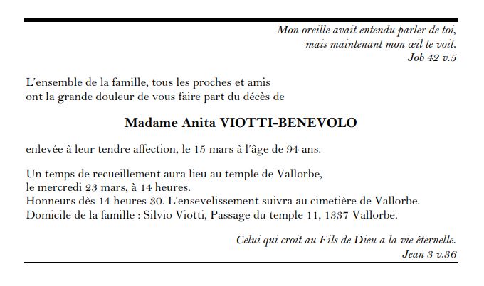 Madame Anita VIOTTI-BENEVOLO 12 juin. 1927 - 15 mar. 2022 Avis mortuaire PFG Télecharger PDF Partager sur: Galerie PreviousNext PreviousNext