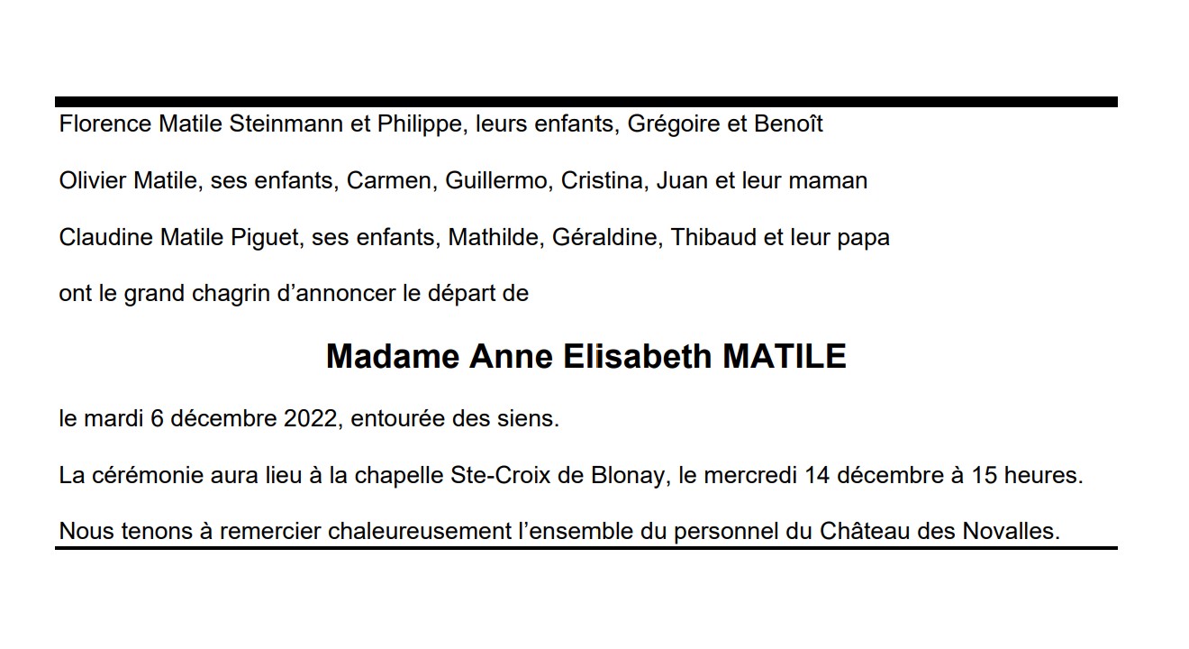 Madame Anne Elisabeth MATILE 16 avr. 1935 - 06 déc. 2022 Avis mortuaire PFG Télecharger PDF Partager sur: Galerie PreviousNext PreviousNext