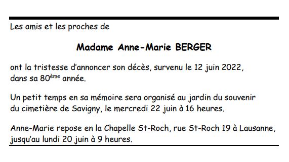 Madame Anne-Marie BERGER 11 juil. 1942 - 12 juin. 2022 Avis mortuaire PFG Télecharger PDF Partager sur: Galerie PreviousNext PreviousNext