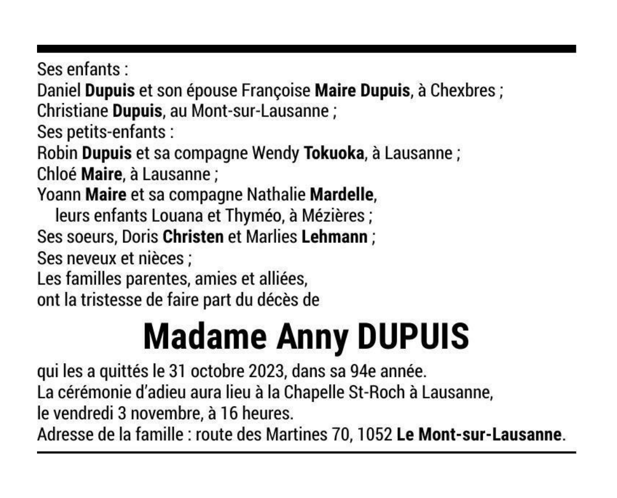 Madame Anny DUPUIS 19 juil. 1930 - 31 oct. 2023 Avis mortuaire PFG Télecharger PDF Partager sur: Galerie PreviousNext PreviousNext