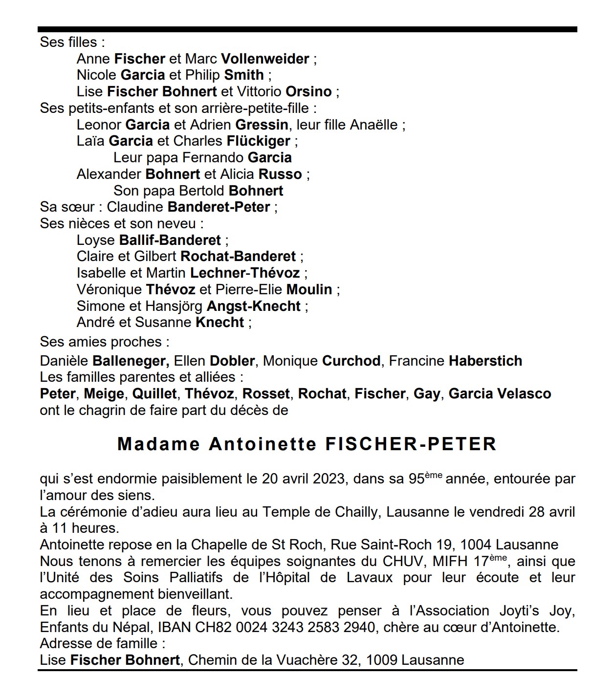 Madame Antoinette FISCHER-PETER 15 mai. 1928 - 20 avr. 2023 Avis mortuaire PFG Télecharger PDF Partager sur: Galerie PreviousNext PreviousNext
