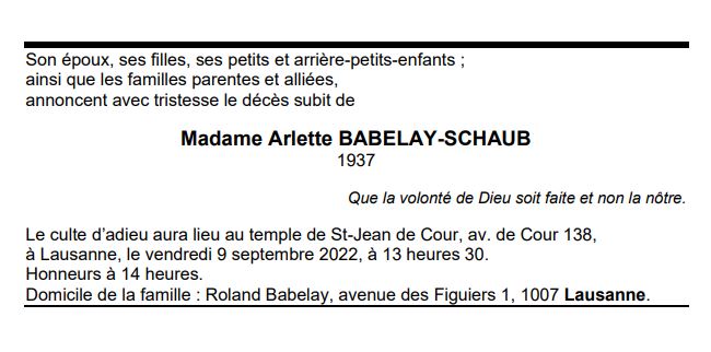 Madame Arlette BABELAY-SCHAUB 08 avr. 1937 - 05 sep. 2022 Avis mortuaire PFG Télecharger PDF Partager sur: Galerie PreviousNext PreviousNext