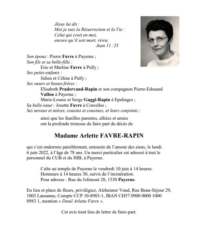 Madame Arlette FAVRE-RAPIN 28 fév. 1944 - 06 juin. 2022 Avis mortuaire PFG Télecharger PDF Partager sur: Galerie PreviousNext PreviousNext