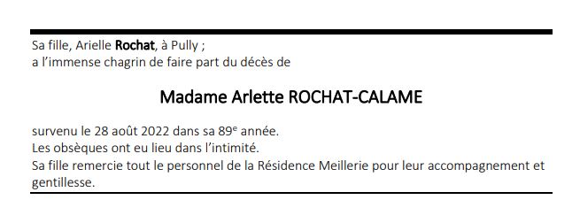 Madame Arlette ROCHAT-CALAME 28 sep. 1933 - 28 aoû. 2022 Avis mortuaire PFG Télecharger PDF Partager sur: Galerie PreviousNext PreviousNext