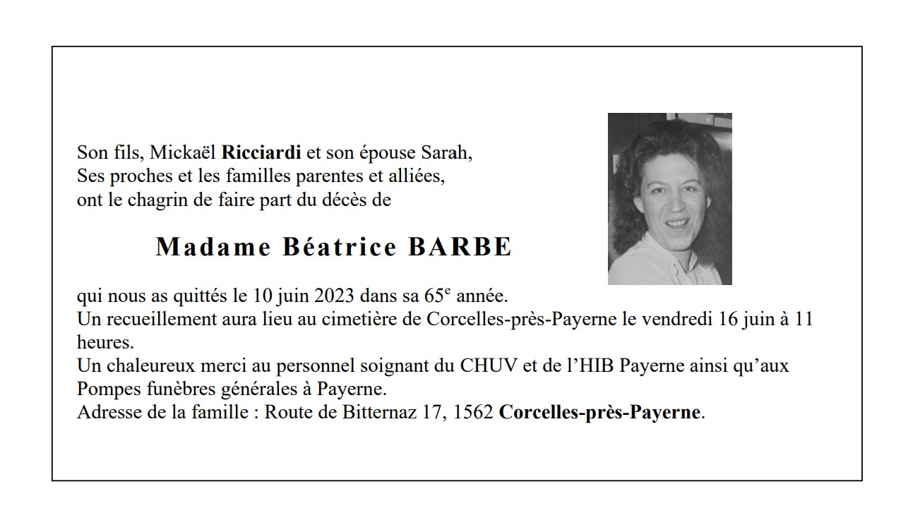 Madame Béatrice BARBÉ 24 juin. 1958 - 10 juin. 2023 Avis mortuaire PFG Télecharger PDF Partager sur: Galerie PreviousNext PreviousNext
