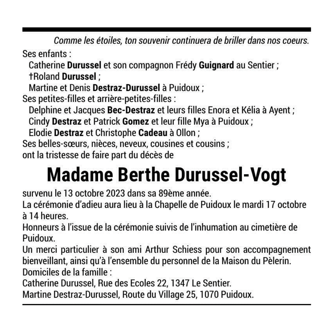 Madame Berthe Durussel-Vogt 10 mai. 1935 - 13 oct. 2023 Avis mortuaire PFG Télecharger PDF Partager sur: Galerie