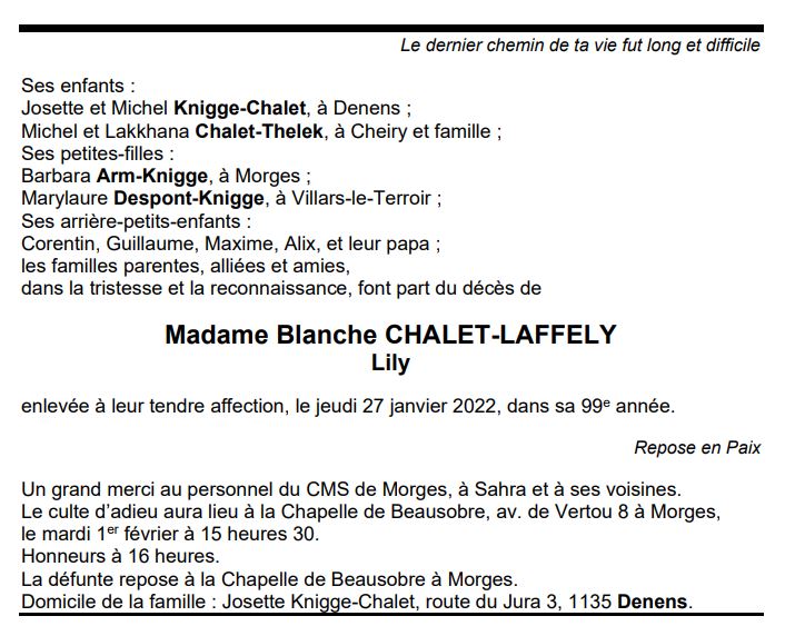 Madame Blanche CHALET-LAFFELY 18 juin. 1923 - 27 jan. 2022 Avis mortuaire PFG Télecharger PDF Partager sur: Galerie PreviousNext PreviousNext