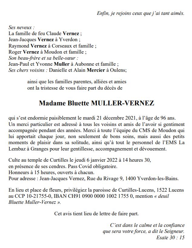 Madame Bluette MULLER-VERNEZ 13 juil. 1925 - 21 déc. 2021 Avis mortuaire PFG Télecharger PDF Partager sur: Galerie PreviousNext PreviousNext