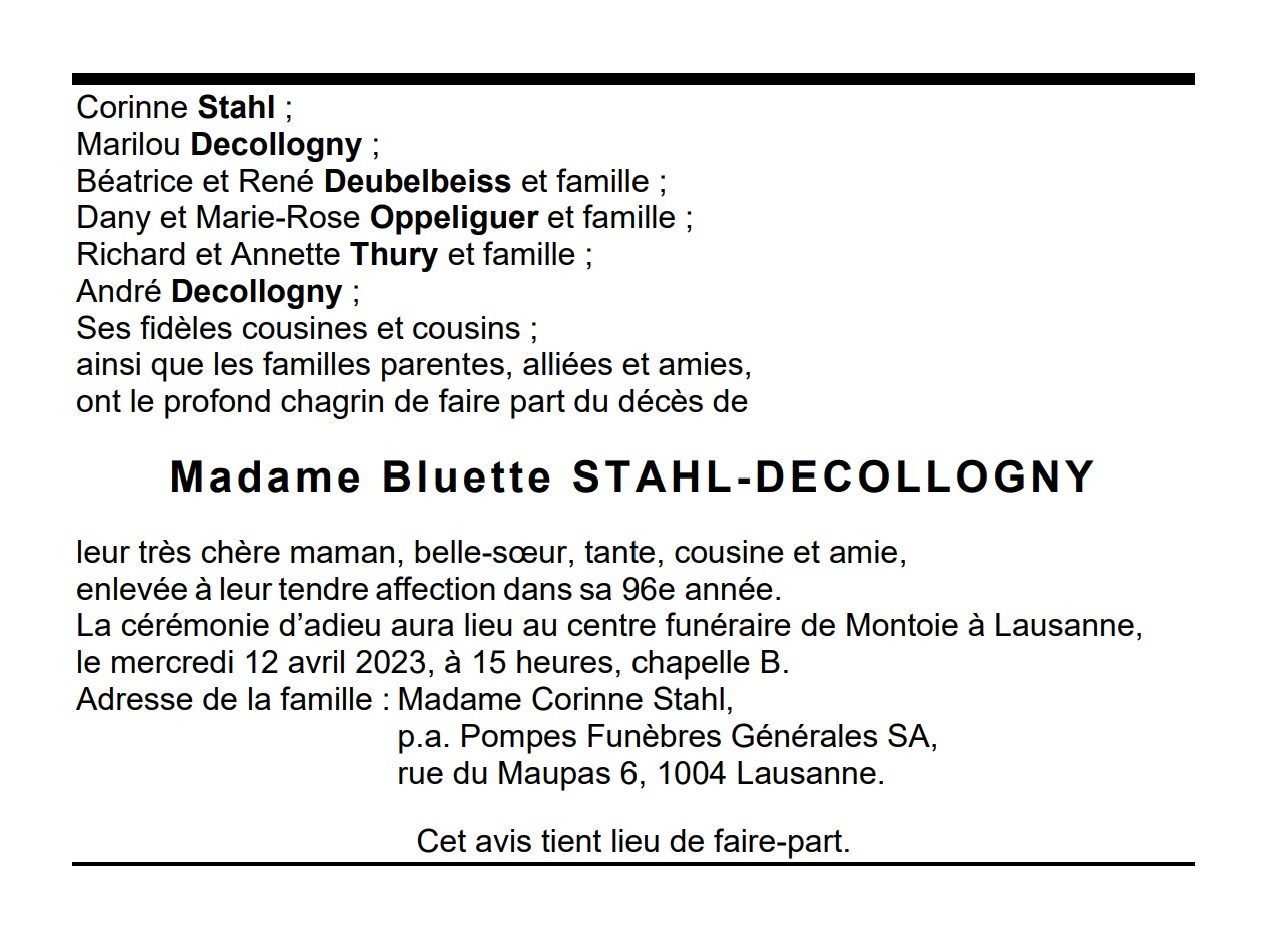 Madame Bluette STAHL-DECOLLOGNY 18 juin. 1927 - 01 avr. 2023 Avis mortuaire PFG Télecharger PDF Partager sur: Galerie PreviousNext PreviousNext