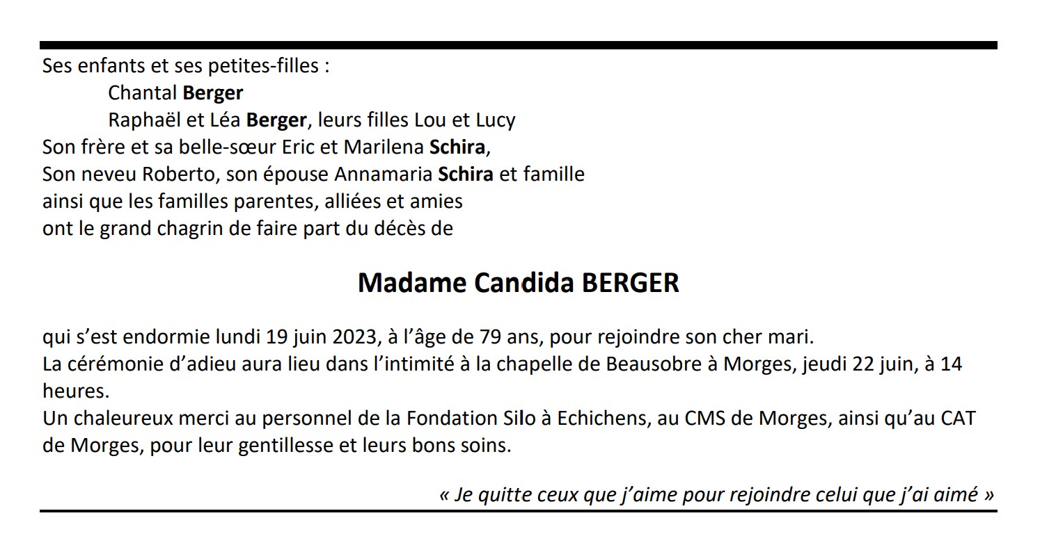 Madame Candida BERGER 15 fév. 1944 - 19 juin. 2023 Avis mortuaire PFG Télecharger PDF Partager sur: Galerie PreviousNext PreviousNext