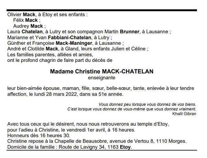 Madame Christine MACK-CHATELAN 07 juil. 1971 - 28 mar. 2022 Avis mortuaire PFG Télecharger PDF Partager sur: Galerie PreviousNext PreviousNext