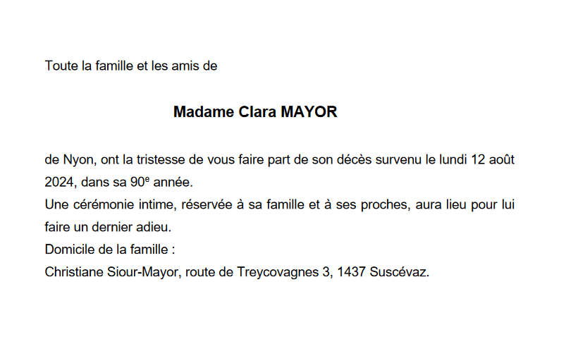 Madame Clara MAYOR 08 déc. 1934 - 12 aoû. 2024 Avis mortuaire PFG Télecharger PDF Partager sur: Galerie