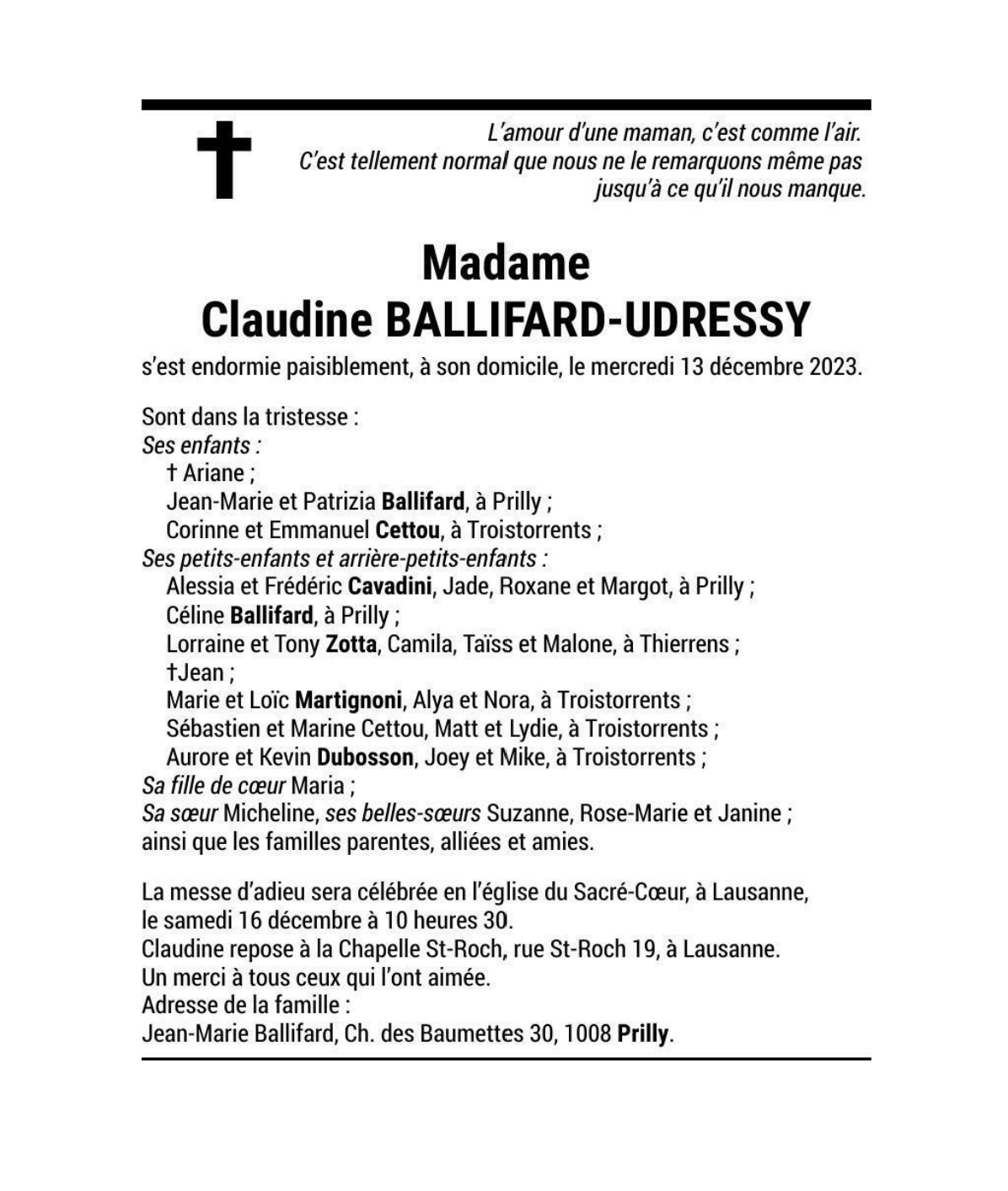 Madame Claudine BALLIFARD-UDRESSY 07 déc. 1938 - 12 déc. 2023 Avis mortuaire PFG Télecharger PDF Partager sur: Galerie PreviousNext PreviousNext