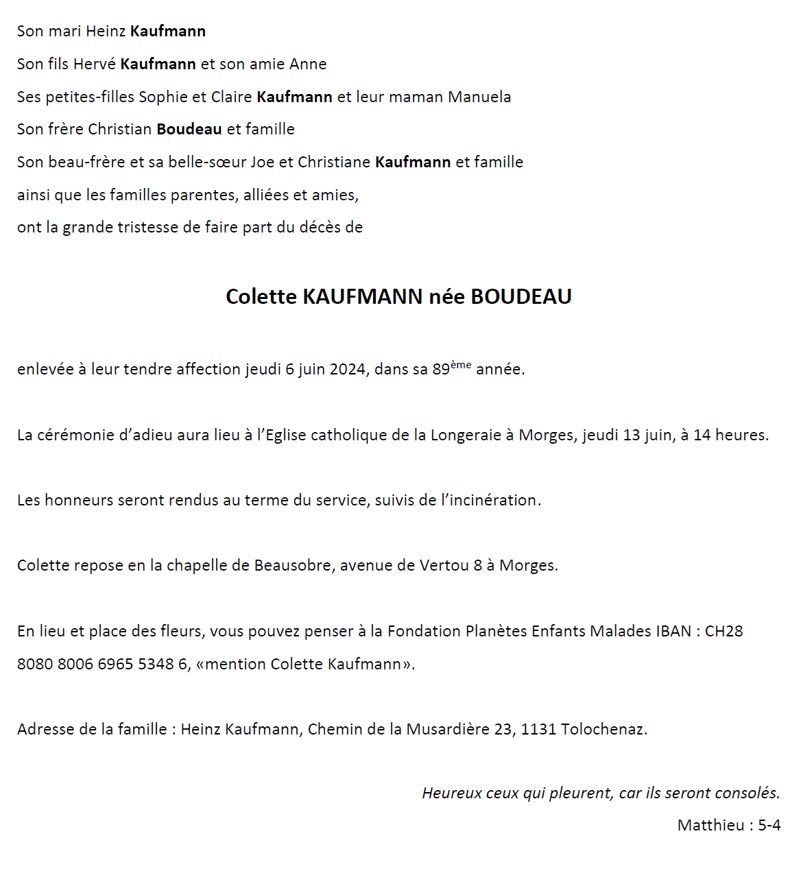 Madame Colette KAUFMANN née BOUDEAU 10 juil. 1935 - 06 juin. 2024 Avis mortuaire PFG Télecharger PDF Partager sur: Galerie PreviousNext PreviousNext