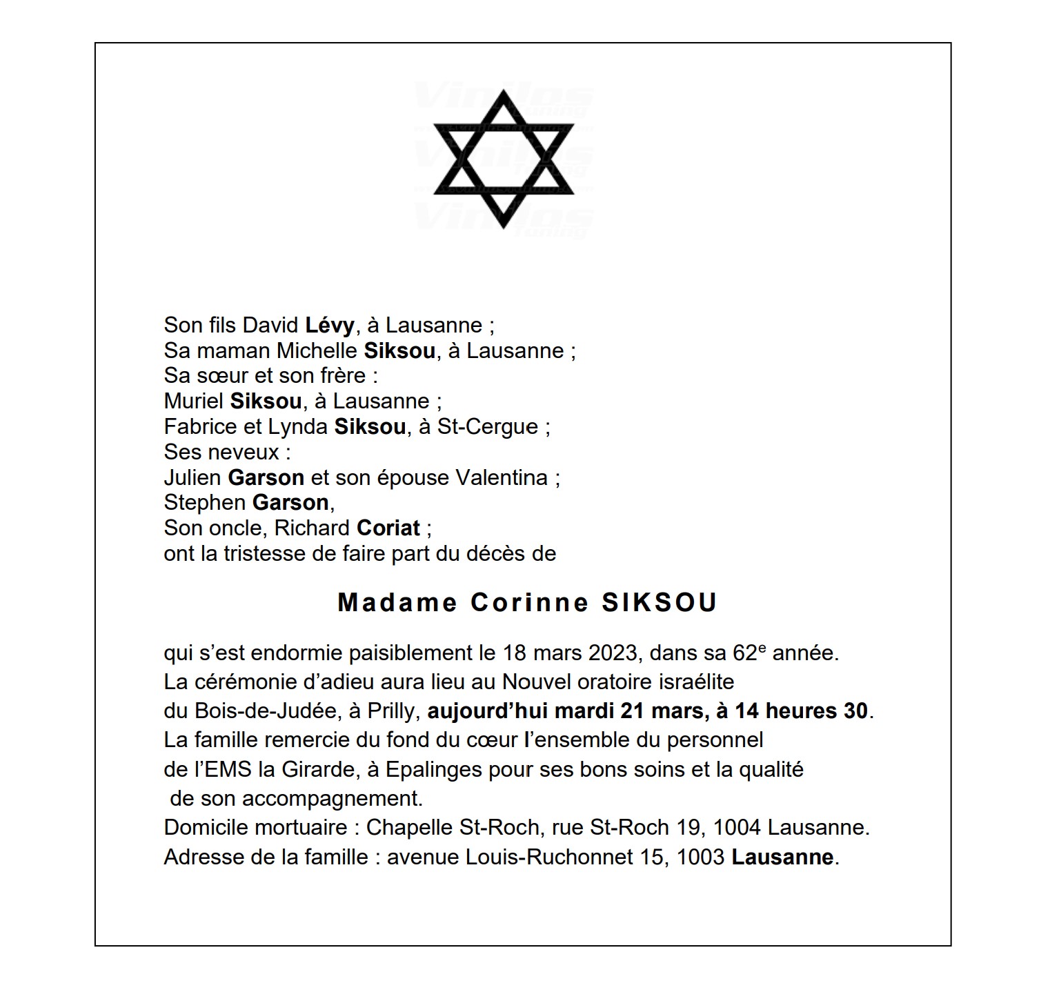 Madame Corinne SIKSOU 23 juin. 1961 - 18 mar. 2023 Avis mortuaire PFG Télecharger PDF Partager sur: Galerie PreviousNext PreviousNext
