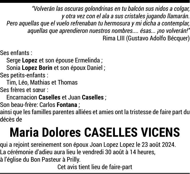 Madame Dolores CASELLES VICENS 23 mar. 1934 - 23 aoû. 2024 Avis mortuaire PFG Partager sur: Galerie PreviousNext PreviousNext