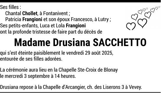 Madame Drusiana SACCHETTO 10 mai. 1934 - 29 aoû. 2025 Avis mortuaire PFG Partager sur: Galerie PreviousNext PreviousNext