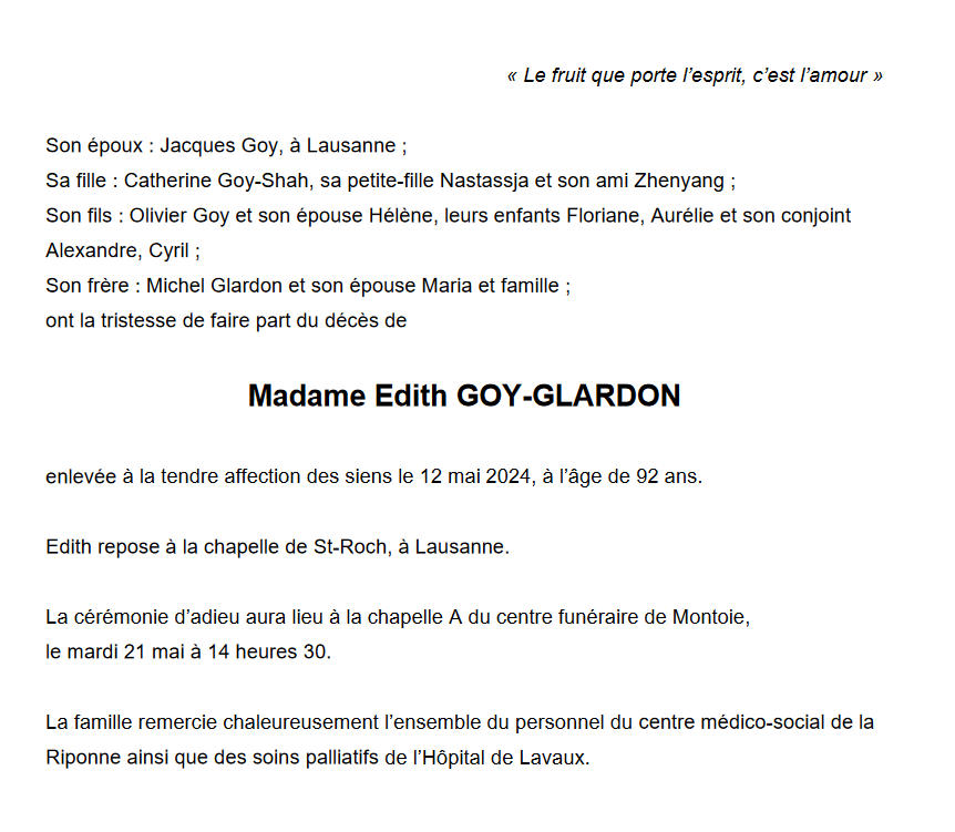 Madame Edith GOY-GLARDON 05 jan. 1932 - 12 mai. 2024 Avis mortuaire PFG Télecharger PDF Partager sur: Galerie PreviousNext PreviousNext