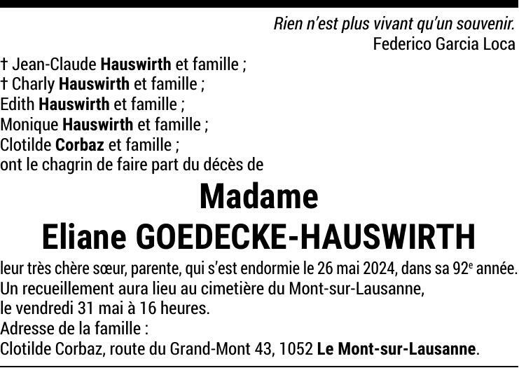 Madame Eliane GOEDECKE-HAUSWIRTH 16 oct. 1932 - 26 mai. 2024 Avis mortuaire PFG Partager sur: Galerie