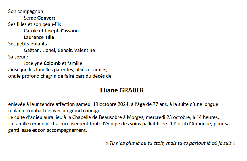 Madame Eliane GRABER 11 jan. 1947 - 19 oct. 2024 Avis mortuaire PFG Télecharger PDF Partager sur: Galerie