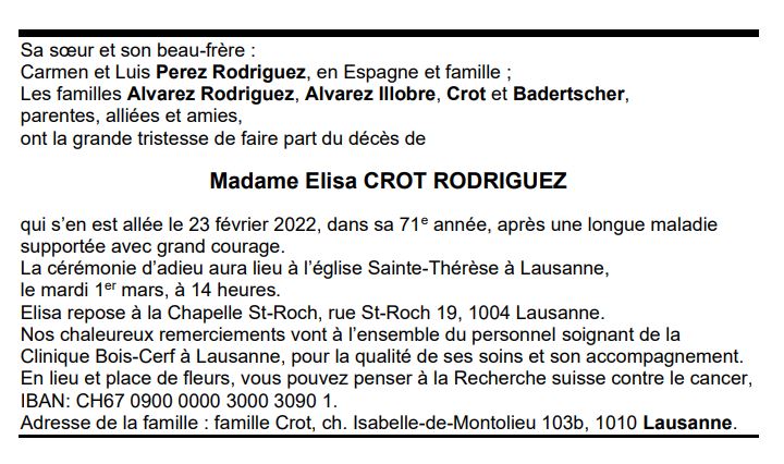 Madame Elisa CROT RODRIGUEZ 15 mai. 1951 - 23 fév. 2022 Avis mortuaire PFG Télecharger PDF Partager sur: Galerie PreviousNext PreviousNext