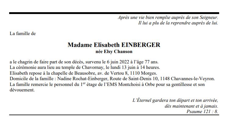 Madame Elisabeth EINBERGER 12 jan. 1945 - 06 juin. 2022 Avis mortuaire PFG Télecharger PDF Partager sur: Galerie PreviousNext PreviousNext