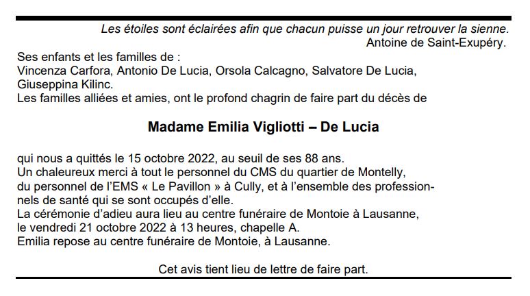 Madame Emilia Vigliotti – De Lucia 11 déc. 1934 - 15 oct. 2022 Avis mortuaire PFG Télecharger PDF Partager sur: Galerie PreviousNext PreviousNext