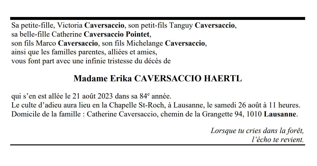 Madame Erika CAVERSACCIO HAERTL 10 juin. 1939 - 21 aoû. 2023 Avis mortuaire PFG Télecharger PDF Partager sur: Galerie PreviousNext PreviousNext