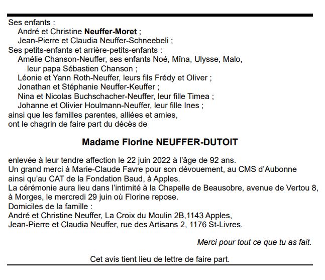 Madame Florine NEUFFER 15 jan. 1930 - 22 juin. 2022 Avis mortuaire PFG Télecharger PDF Partager sur: Galerie PreviousNext PreviousNext