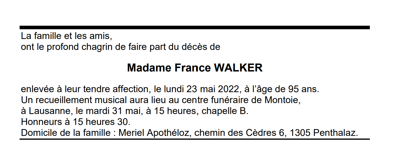 Madame France WALKER 04 oct. 1926 - 23 mai. 2022 Avis mortuaire PFG Télecharger PDF Partager sur: Galerie PreviousNext PreviousNext