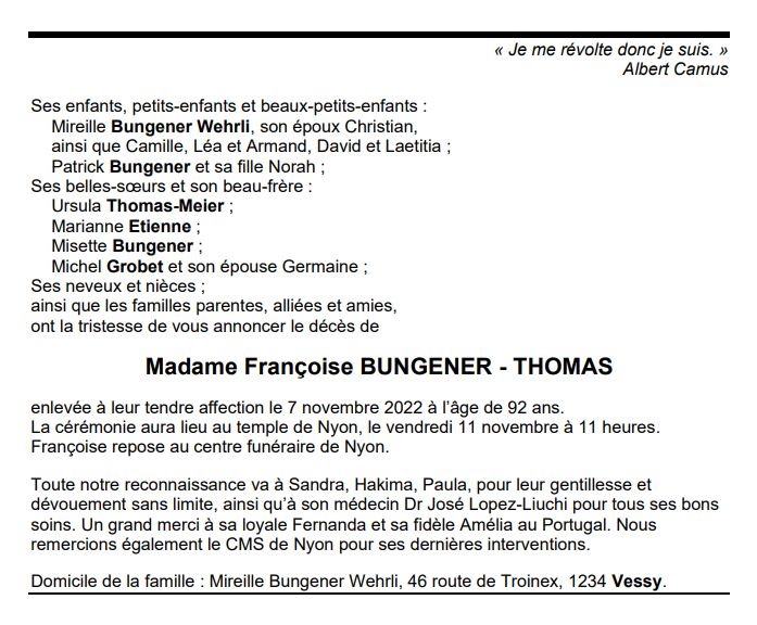 Madame Françoise BUNGENER - THOMAS 04 mar. 1930 - 07 nov. 2022 Avis mortuaire PFG Télecharger PDF Partager sur: Galerie PreviousNext PreviousNext