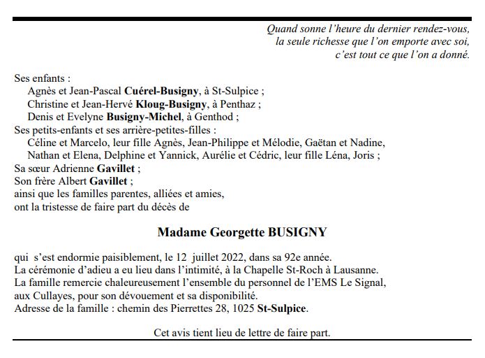 Madame Georgette BUSIGNY 15 déc. 1930 - 12 juil. 2022 Avis mortuaire PFG Télecharger PDF Partager sur: Galerie PreviousNext PreviousNext