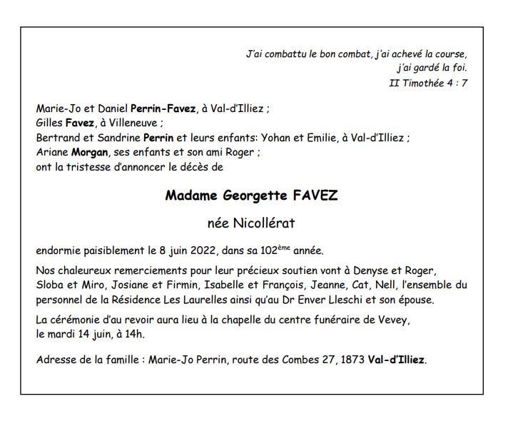 Madame Georgette FAVEZ 10 oct. 1920 - 08 juin. 2022 Avis mortuaire PFG Télecharger PDF Partager sur: Galerie PreviousNext PreviousNext